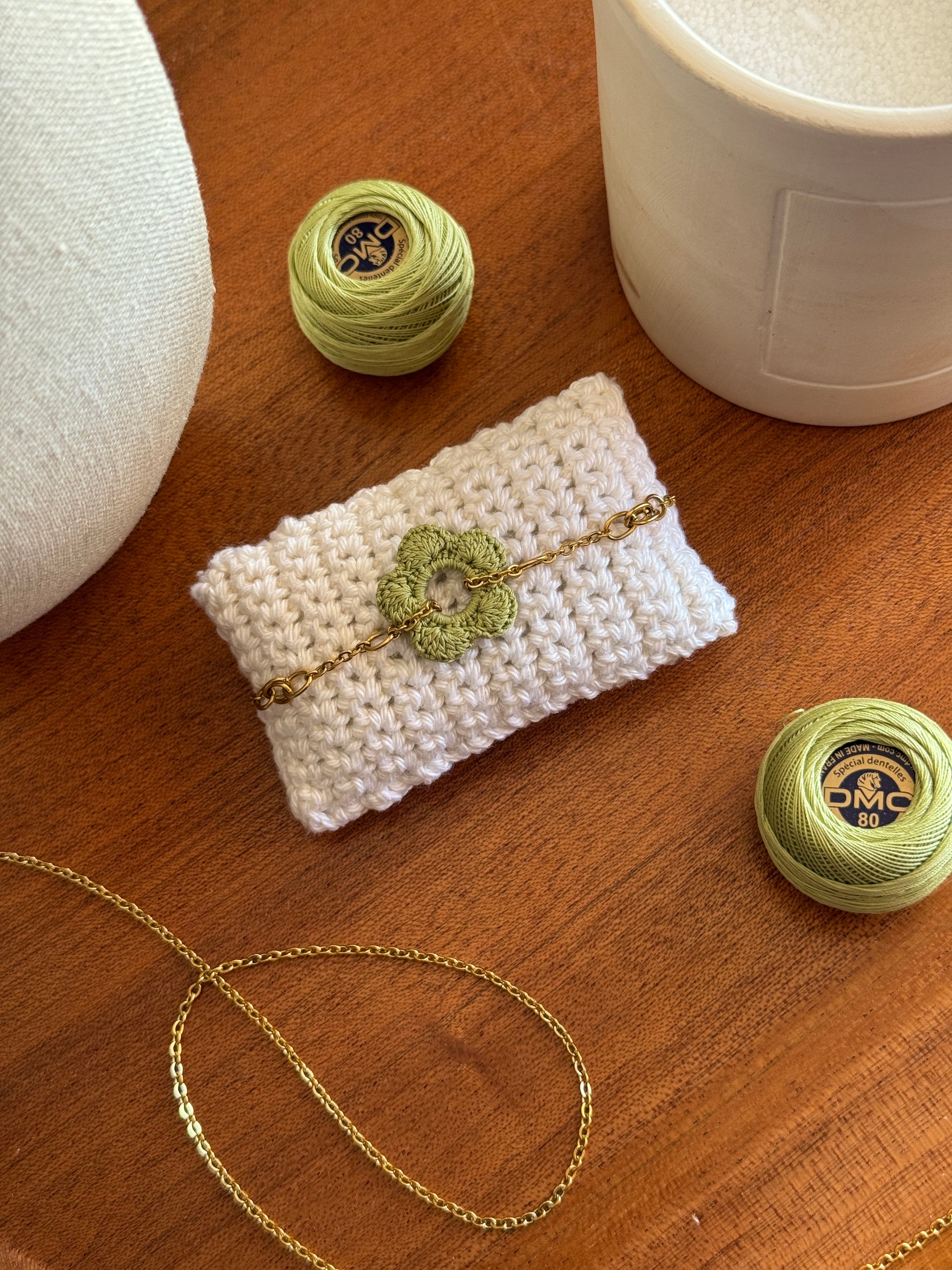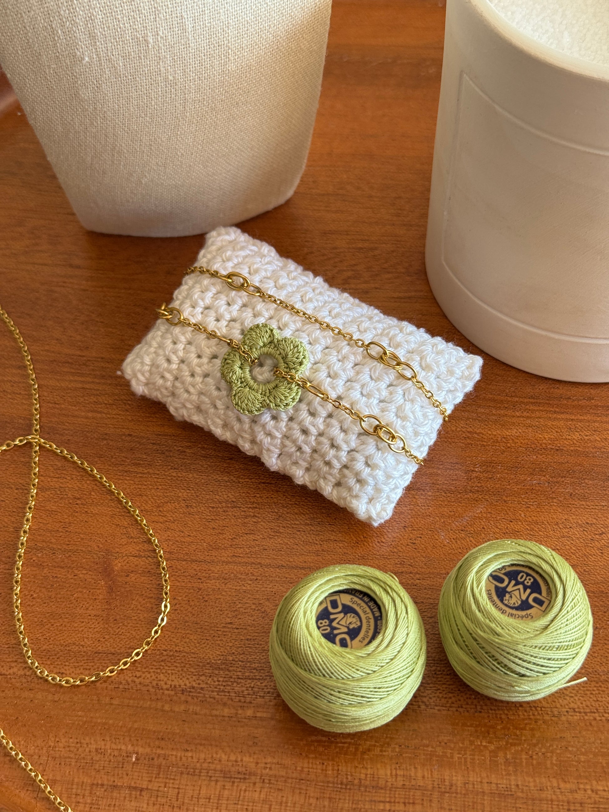 Au centre, une fleur crochetée à la main et personnalisable avec la couleur de votre choix.